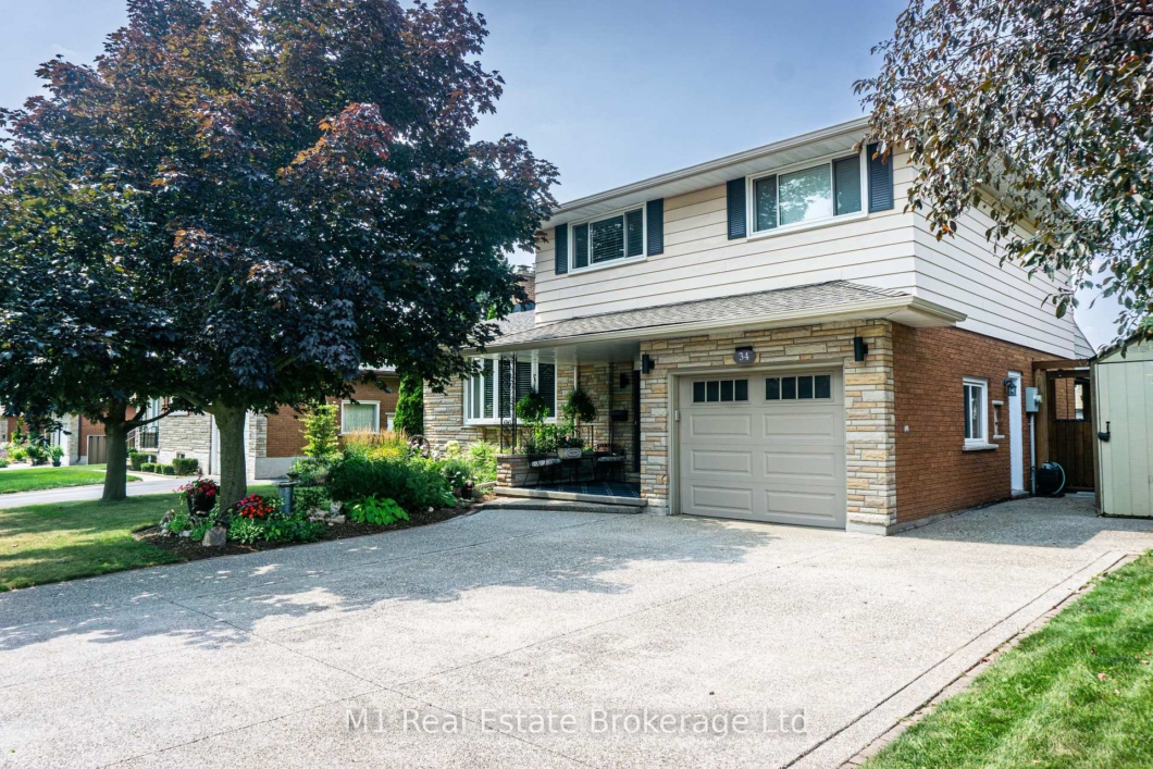 Welcome to 34 Strathcona Crescent, a beautifully updated and meticulously maintained home nestled on a spacious 63×100 lot in a quiet, family-friendly Kitchener neighbourhood. From the moment you arrive, you’ll be drawn in by the charming curb appeal, featuring a covered front porch, exposed aggregate concrete driveway, and lush, extensively landscaped perennial gardens in both the front and backyards. Step through the upgraded front door into a welcoming foyer that flows effortlessly into an open-concept living and dining areaperfect for both everyday living and entertaining.The main level boasts gleaming hardwood floors and French doors leading into a bright and spacious layout. A stunning kitchen renovation completed in 2016 features modern finishes and smart functionality, while the Hollywood staircase adds architectural interest. The home continues to impress with a beautifully updated 5-piece bathroom, complete with a walk-in shower, luxurious 5.5-foot air tub, and radiant heated flooring. The primary bedroom offers a full wall of built-in closet space, with original hardwood continuing in the back room and additional bedrooms.Enjoy seamless indoor-outdoor living with sliding rear doors that open onto an extra-large 16×20 deck and a 12×24 covered patio equipped with privacy shades and dual ceiling fans ideal for summer relaxation and gatherings. The fully fenced yard includes barn door-style sliding side gates and three large sheds for ample storage.Peace of mind comes standard with a long list of mechanical and structural upgrades: all windows were replaced with Strassburger models in 2007, the side door and window were updated in 2019, the Waterloo Garage Door and opener were installed in 2018, and a new furnace and AC unit were added in 2022. Additional features include a 200 amp electrical service, whole-home water filtration. This home truly blends comfort, function, and timeless style ready for you to move in and enjoy.